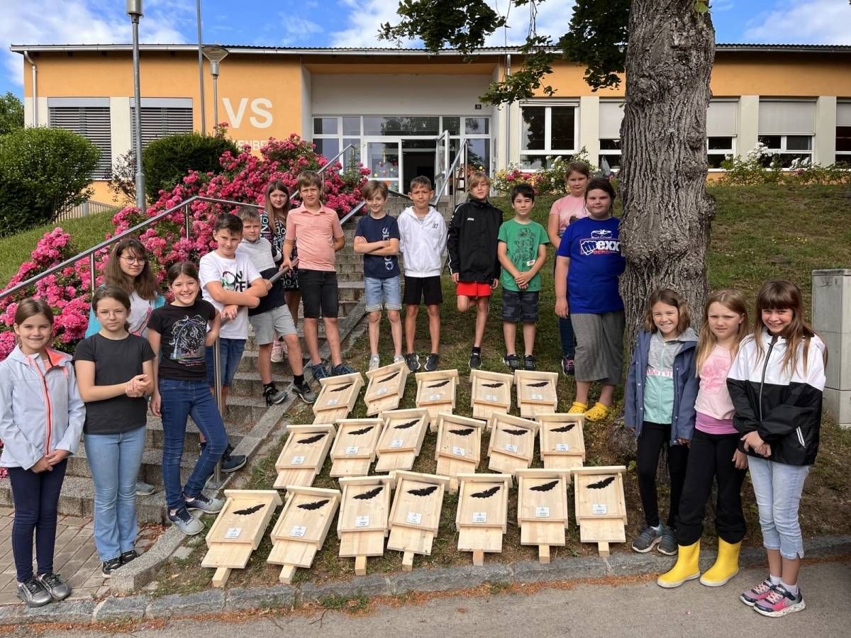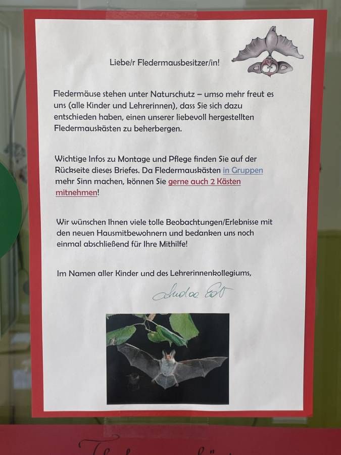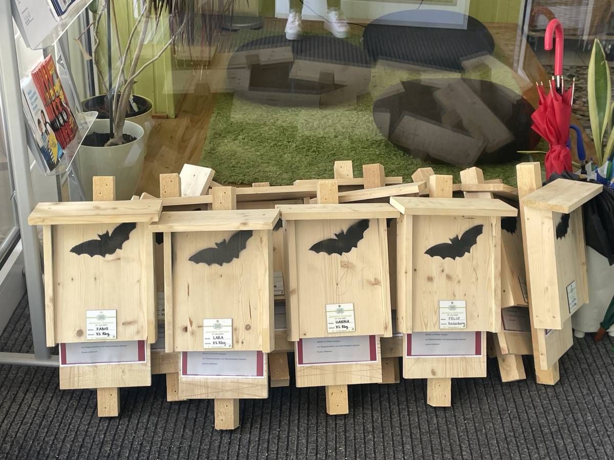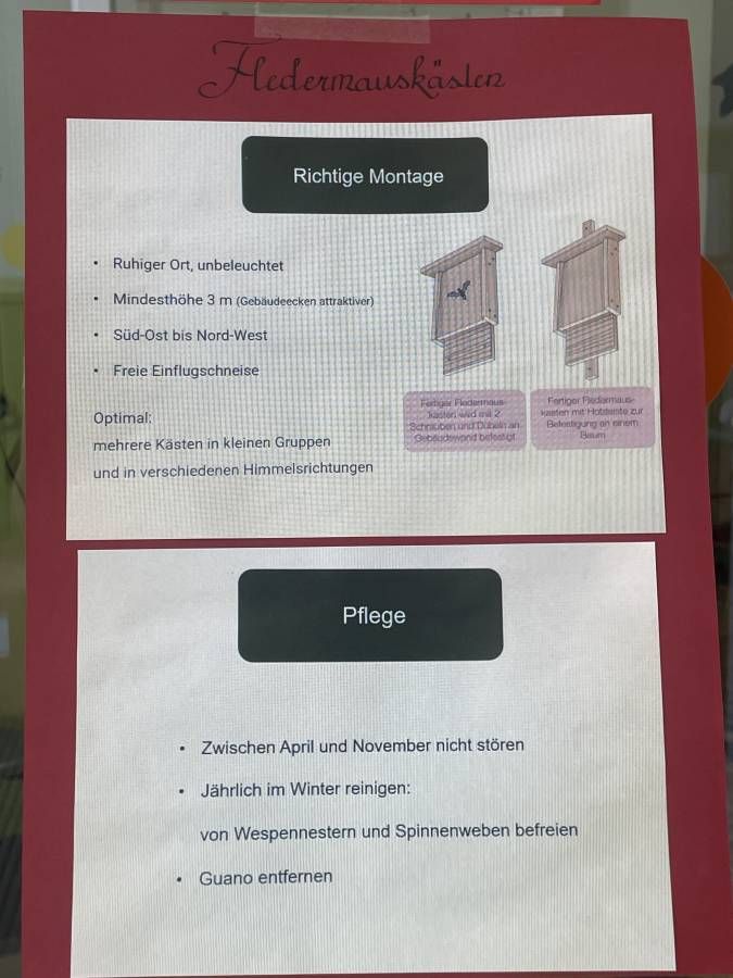 Fledermäuse stehen bei uns unter Natur-/Artenschutz. Den Winter verbringen sie bekanntlich hängend auf Dachböden etc. Im Frühling, Sommer und Herbst jedoch sind sie auf geeignete Unterkünfte tagsüber angewiesen - sie lieben Fledermauskästen, die man ganz einfach selbst herstellen kann. Deshalb haben wir bereits vor längerer Zeit solche Kästen mit den Viertklässlern gebaut - aus Holz, ohne Zugluftschlitzen, mit Sägelinien, an denen sie gut hochklettern können. Eigentlich wollten wir diese Kästen auf den Bäumen in der Schulumgebung anbringen. Leider müssen einige alte Bäume aufgrund ihrer Krankheit oder aufgrund von Schädlingen gefällt werden - kurzerhand haben wir uns entschlossen, in der Gemeindezeitung einen Aufruf zu starten, auf den hin sich einige Reisenberger/innen einen Kasten für die private Unterbringung aus der Schule geholt haben. Vielen herzlichen Dank für Ihre Mithilfe und Unterstützung!