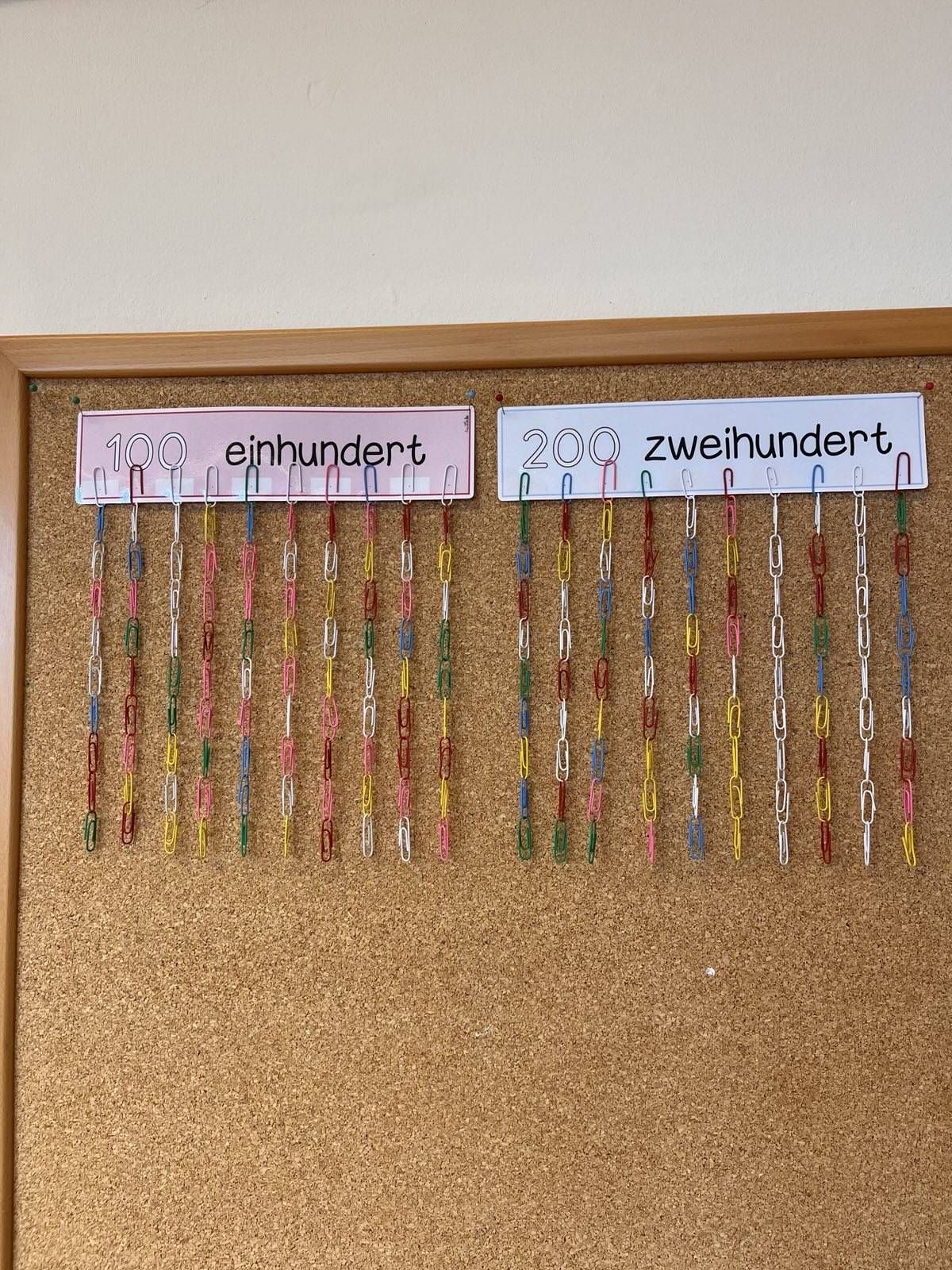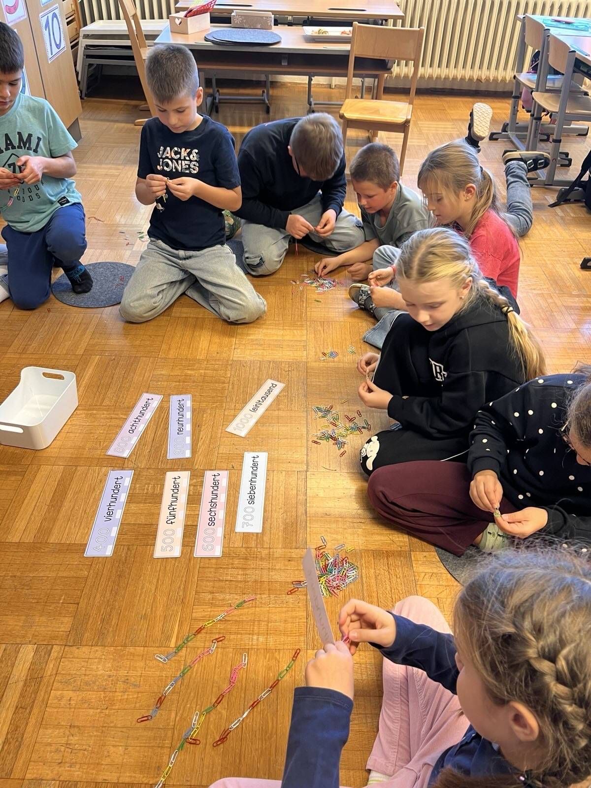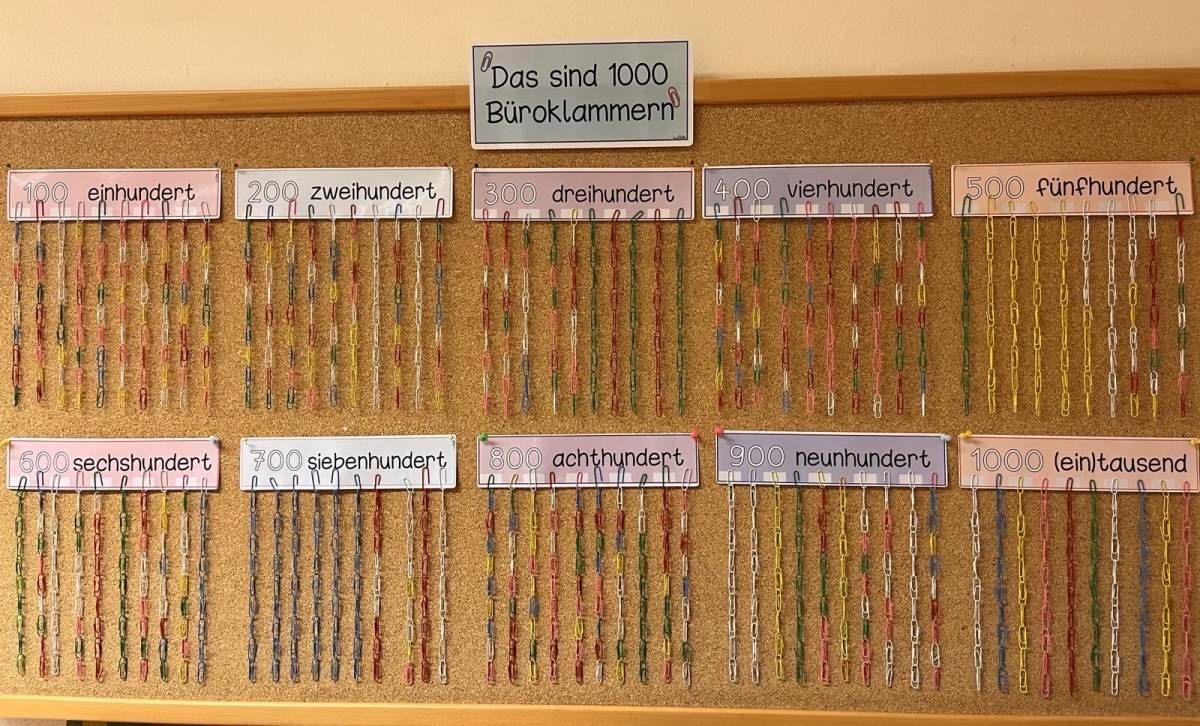 Was man alles um € 1000,- kaufen kann, wissen wahrscheinlich die meisten Erwachsenen. Welche Arbeit es jedoch darstellt, 1000 Büroklammern aufzufädeln, um den Zahlenraum 1000 anschaulich zu machen, das können sich Erwachsene kaum vorstellen. Unsere 3. Kl. hat sich an die Arbeit gemacht und ... nach vielen Unterrichtseinheiten den ZR 1000 gründlich erforscht - und das nur mit Büromaterial und Perlen ;-)