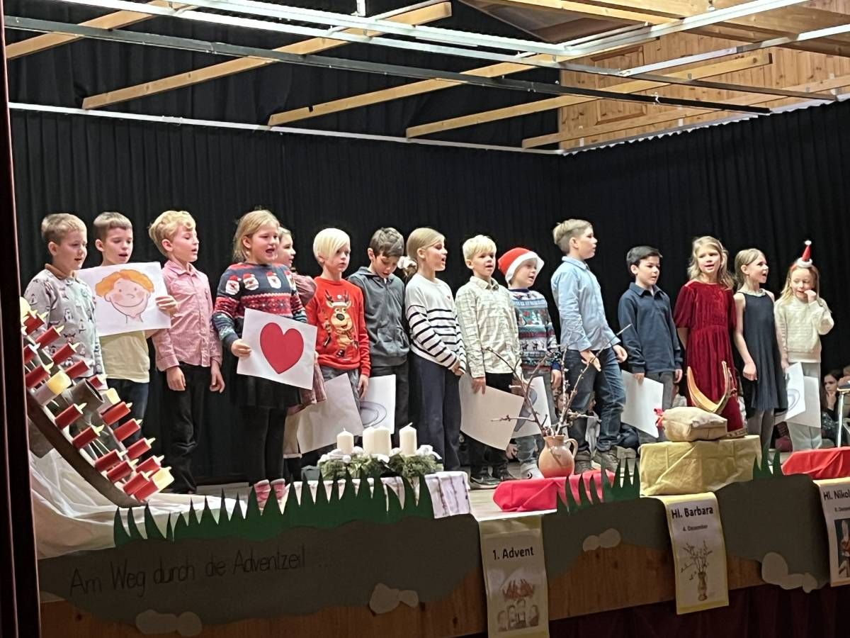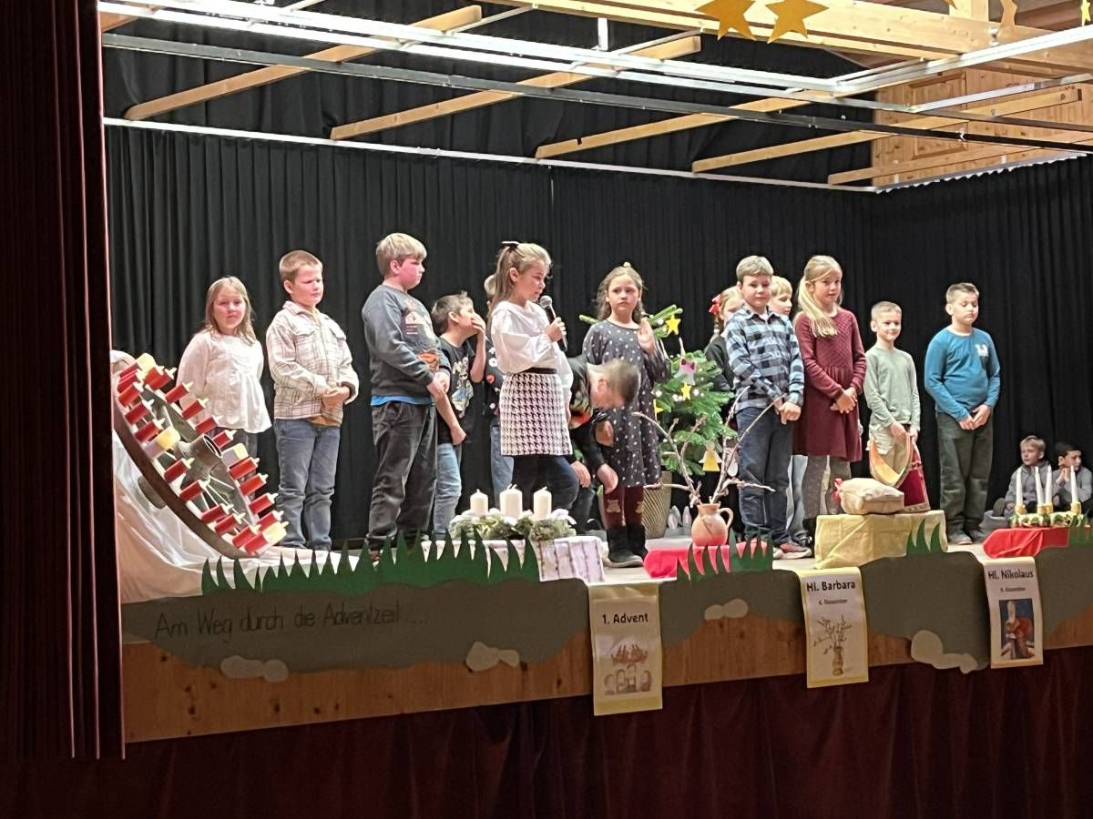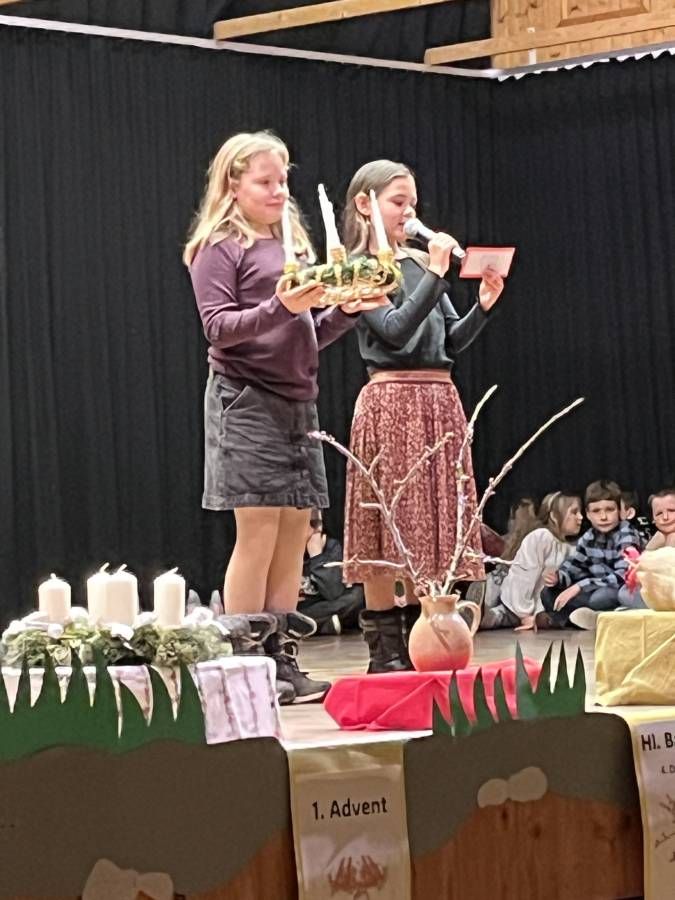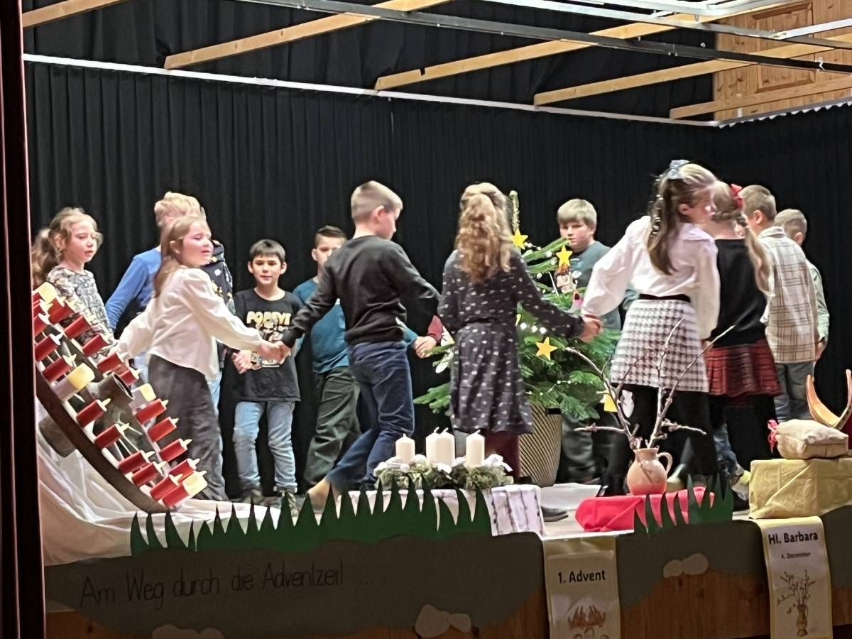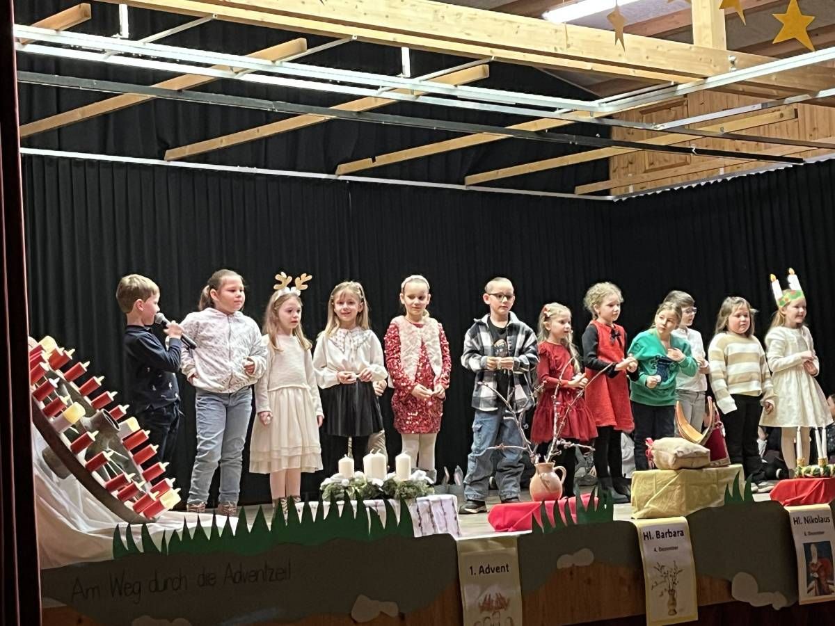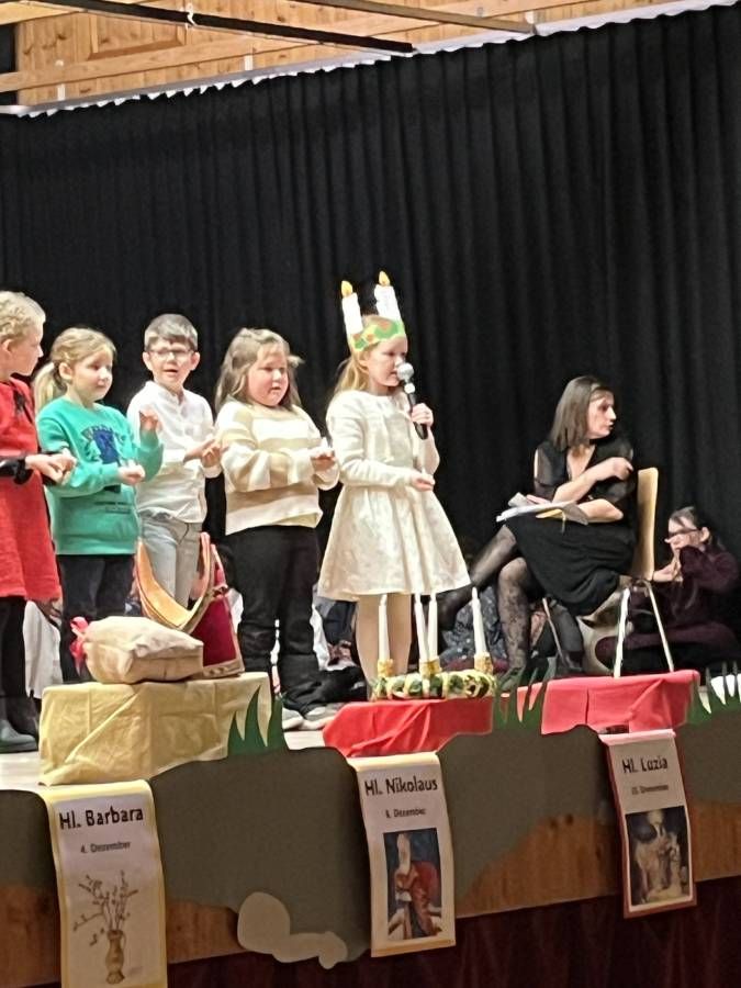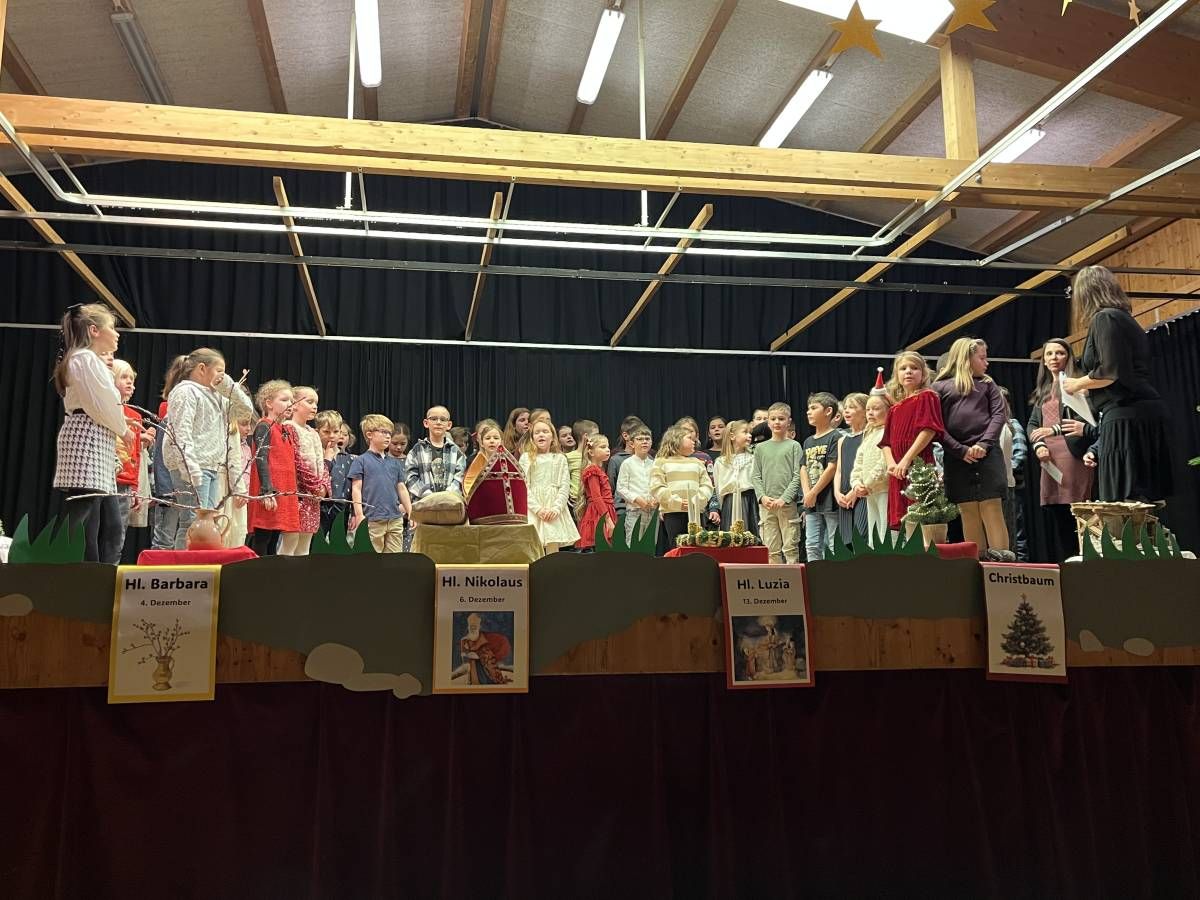 Am Do, dem 18. 12., unternahmen wir gemeinsam mit Eltern, Großeltern und vielen anderen Gästen in der Kulturhalle Reisenberg eine Reise durch die Adventzeit. Unsere Geschichte begann mit dem 1. Adventkranz, den Hr. Johann Hinrich Wichern vor fast 200 Jahren aus einem Wagenrad mit 20 roten Wochentags- und 4 weißen Sonntagskerzen in einem Kinderheim in Deutschland bastelte. Weitere Stationen waren die hl. Barbara, der hl. Nikolaus, die hl. Luzia, der Christbaum und schließlich als Schlusslicht die Krippe im Stall. Viele Lieder, Gedichte und auch ein Tanz wurden den Eltern in einer besinnlichen, feierlichen Atmosphäre geboten. Nach großem Applaus konnten sich alle am Buffet des EVs laben - an dieser Stelle ein ganz großes Dankeschön an alle, die bei den Vorbereitungen, der Durchführung und der Nachbereitung der Feier mitgewirkt haben, denn ohne die Hilfe aller kann so ein Fest nicht zustande kommen! Auch der Musikschule, die uns ebenfalls ohne zu zögern mit ihren Tönen unterstützt, gilt unser großer Dank!