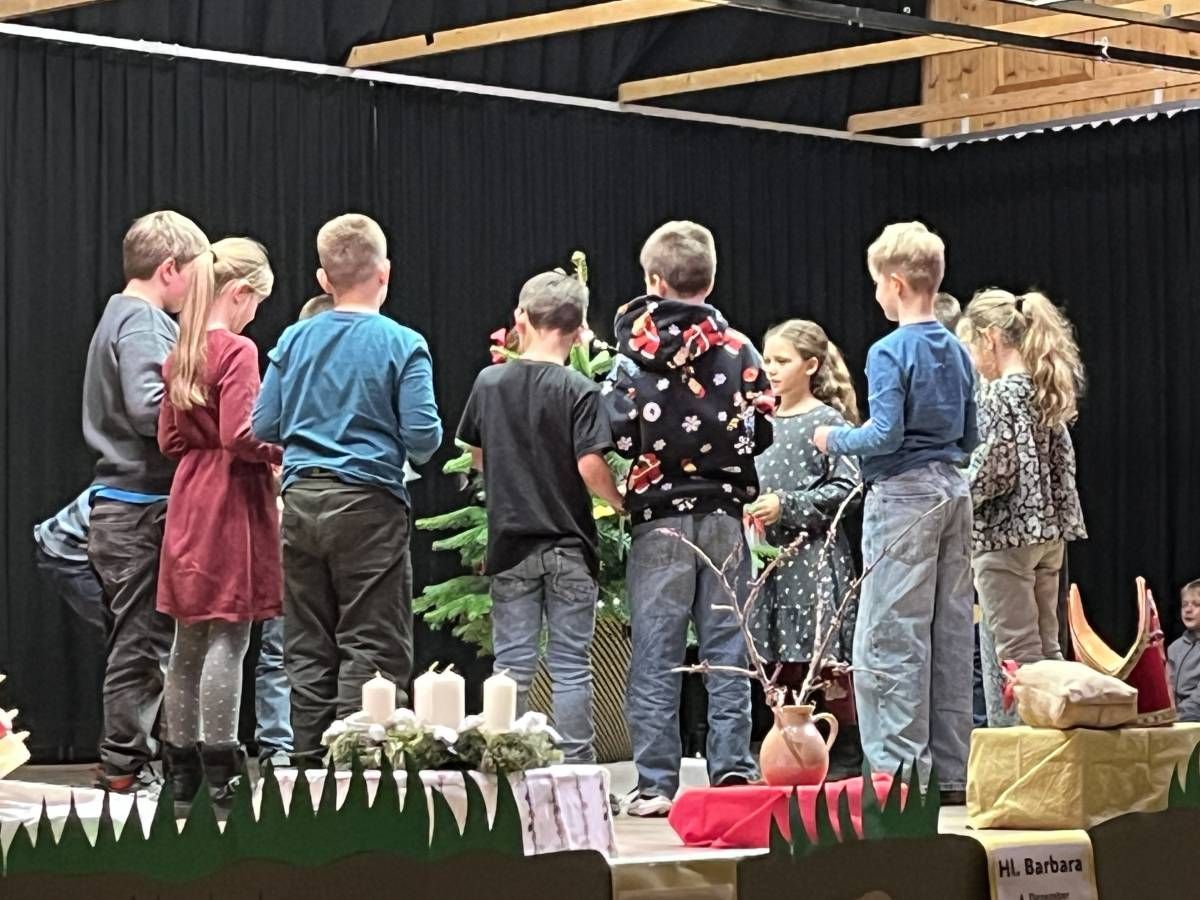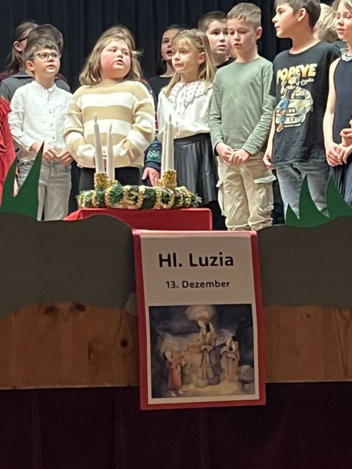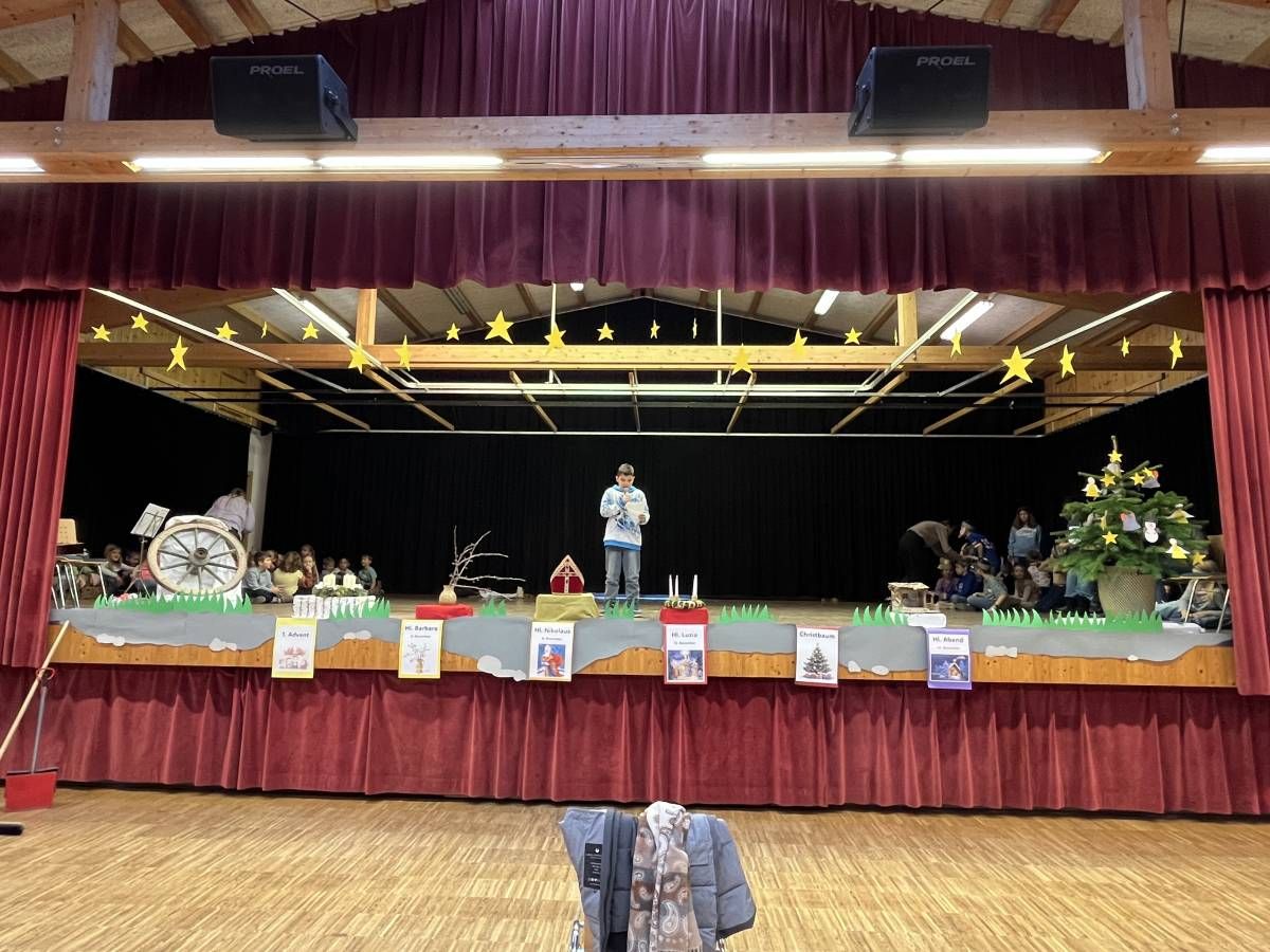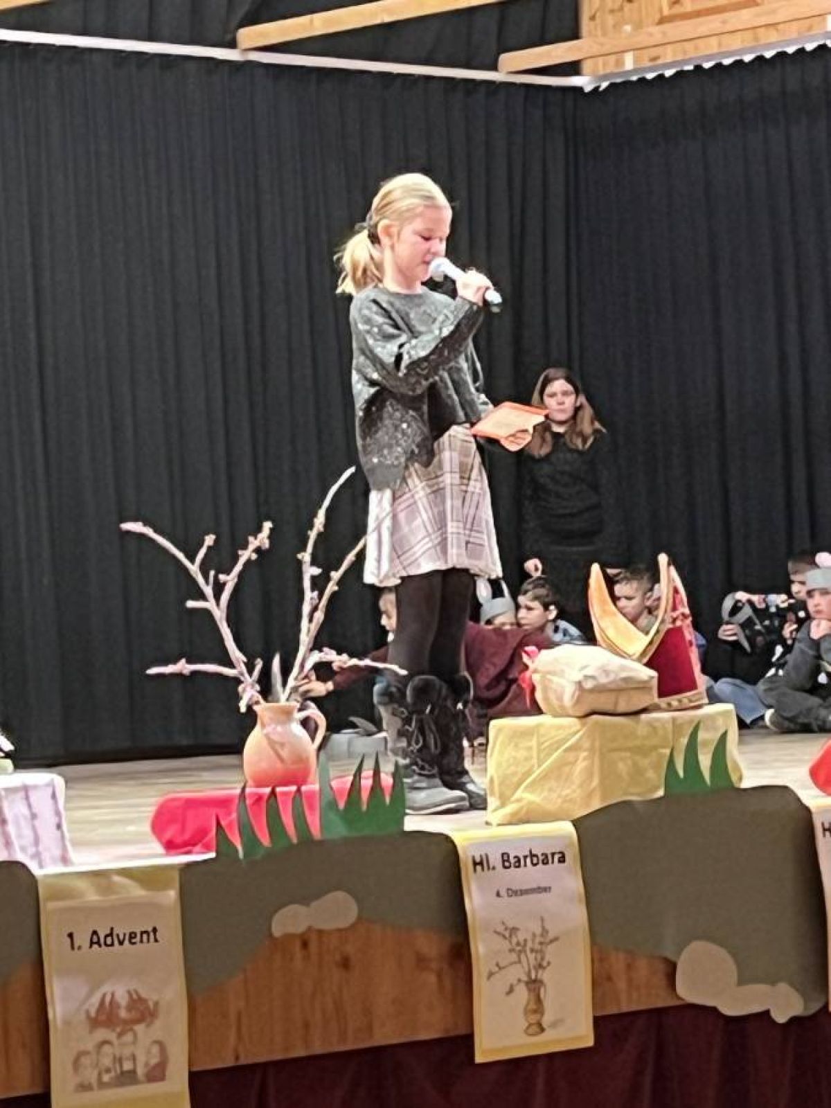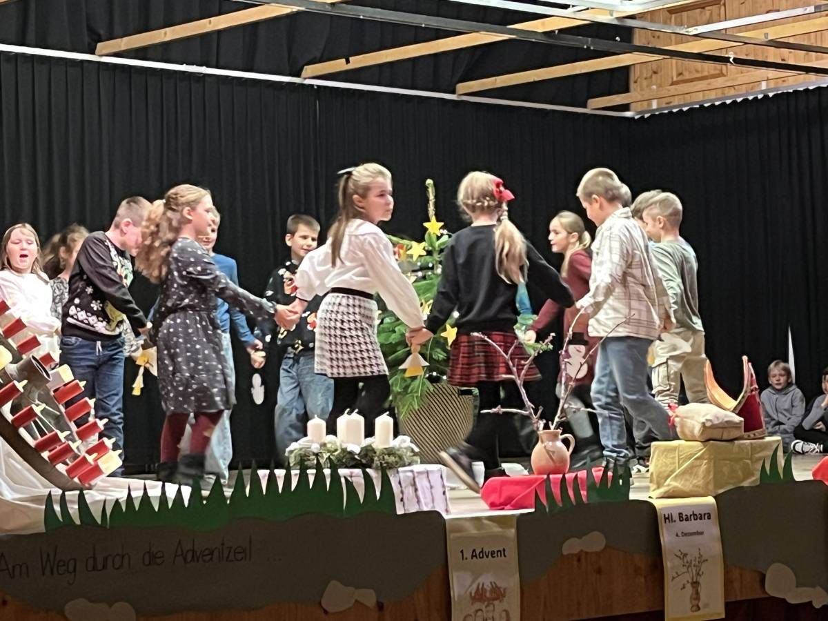 Am Do, dem 18. 12., unternahmen wir gemeinsam mit Eltern, Großeltern und vielen anderen Gästen in der Kulturhalle Reisenberg eine Reise durch die Adventzeit. Unsere Geschichte begann mit dem 1. Adventkranz, den Hr. Johann Hinrich Wichern vor fast 200 Jahren aus einem Wagenrad mit 20 roten Wochentags- und 4 weißen Sonntagskerzen in einem Kinderheim in Deutschland bastelte. Weitere Stationen waren die hl. Barbara, der hl. Nikolaus, die hl. Luzia, der Christbaum und schließlich als Schlusslicht die Krippe im Stall. Viele Lieder, Gedichte und auch ein Tanz wurden den Eltern in einer besinnlichen, feierlichen Atmosphäre geboten. Nach großem Applaus konnten sich alle am Buffet des EVs laben - an dieser Stelle ein ganz großes Dankeschön an alle, die bei den Vorbereitungen, der Durchführung und der Nachbereitung der Feier mitgewirkt haben, denn ohne die Hilfe aller kann so ein Fest nicht zustande kommen! Auch der Musikschule, die uns ebenfalls ohne zu zögern mit ihren Tönen unterstützt, gilt unser großer Dank!