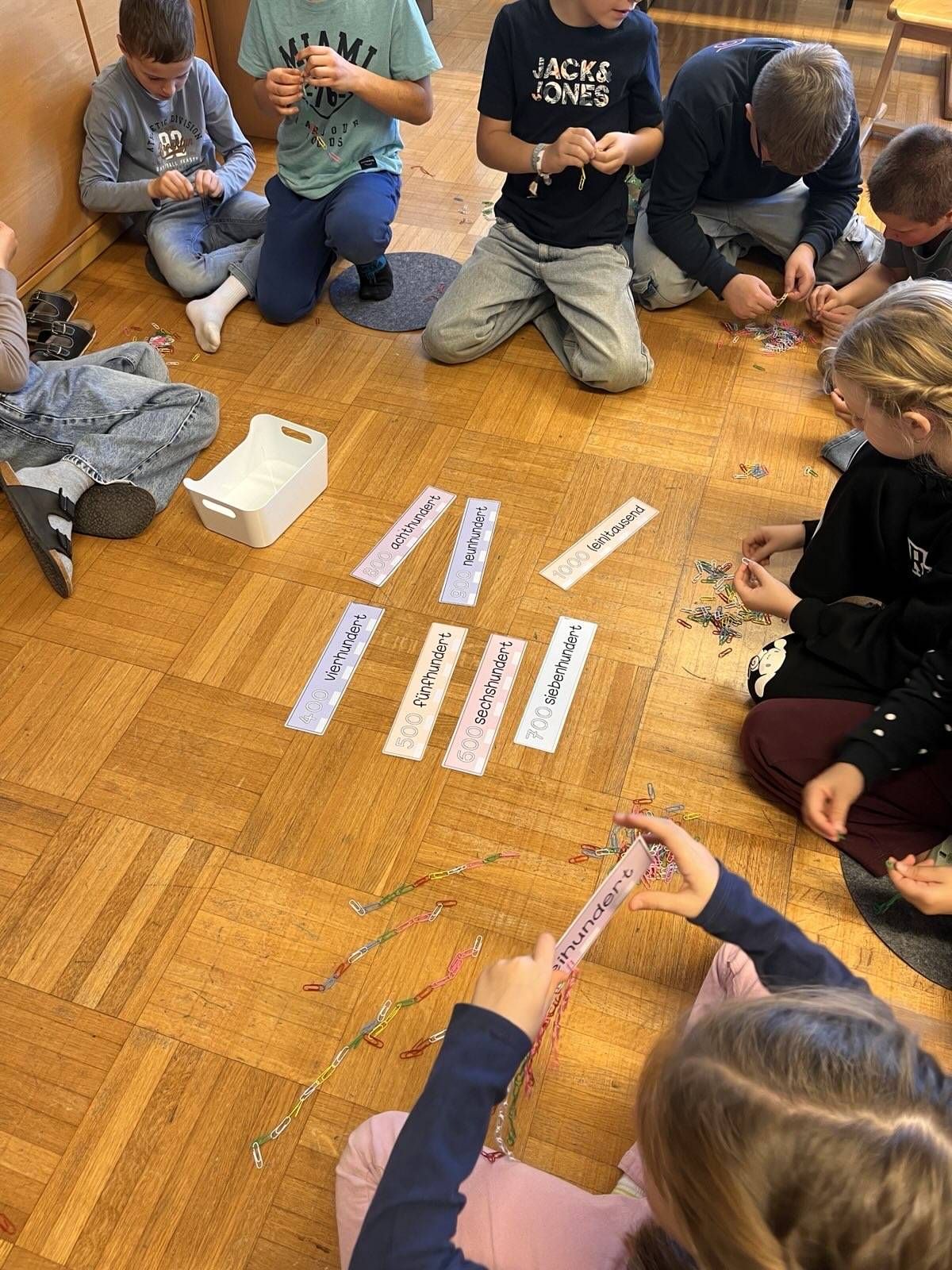 Was man alles um € 1000,- kaufen kann, wissen wahrscheinlich die meisten Erwachsenen. Welche Arbeit es jedoch darstellt, 1000 Büroklammern aufzufädeln, um den Zahlenraum 1000 anschaulich zu machen, das können sich Erwachsene kaum vorstellen. Unsere 3. Kl. hat sich an die Arbeit gemacht und ... nach vielen Unterrichtseinheiten den ZR 1000 gründlich erforscht - und das nur mit Büromaterial und Perlen ;-)