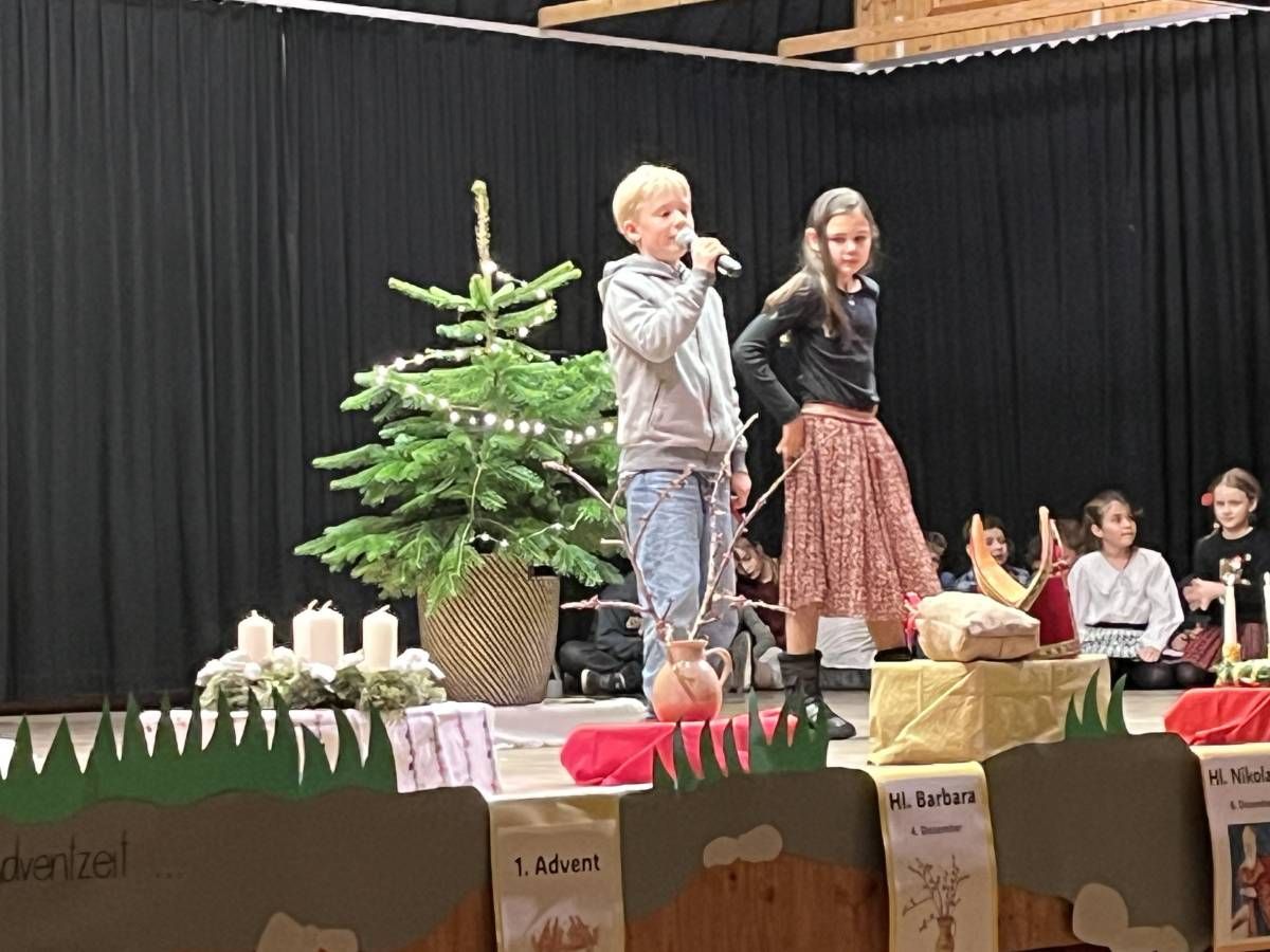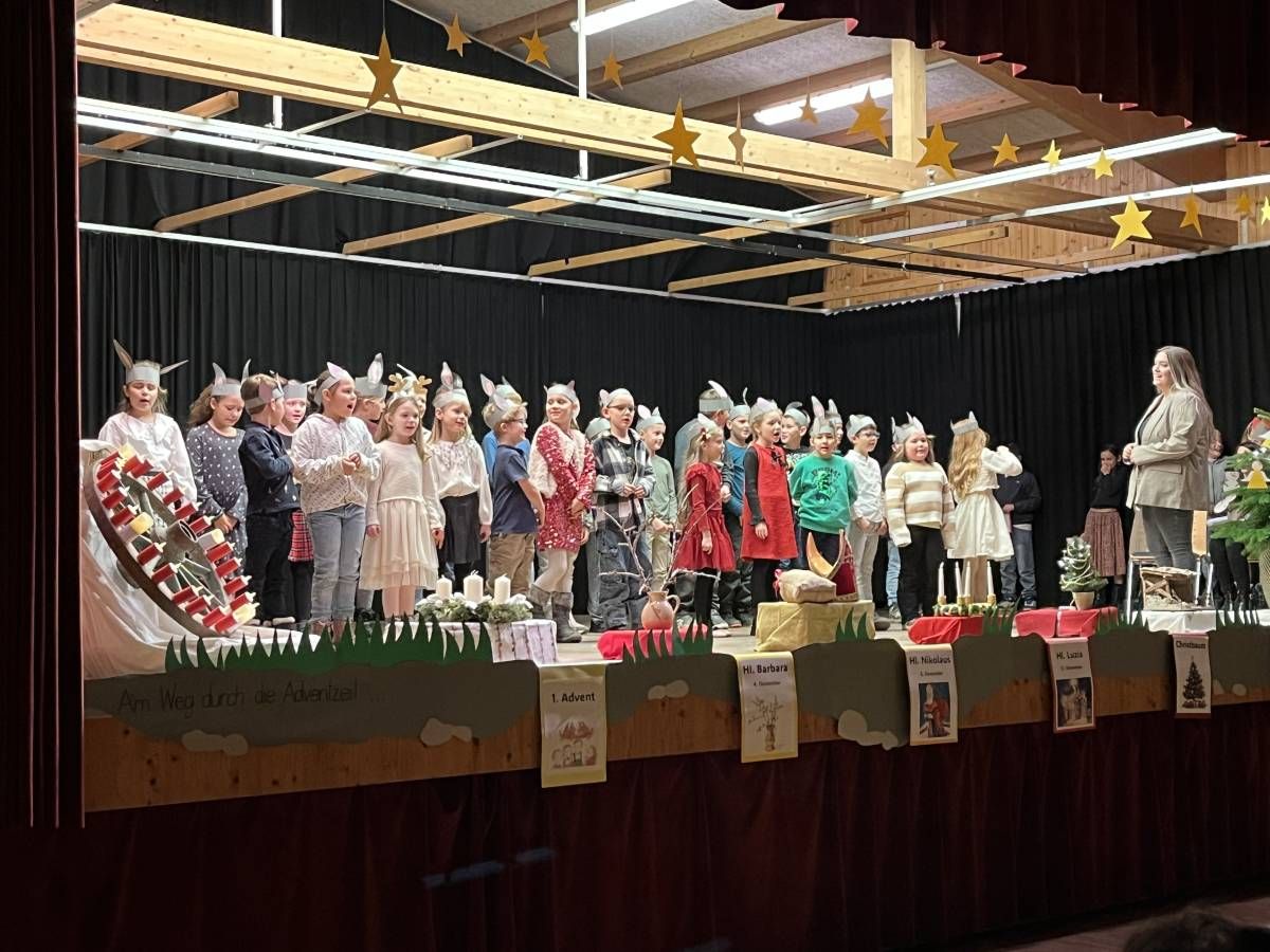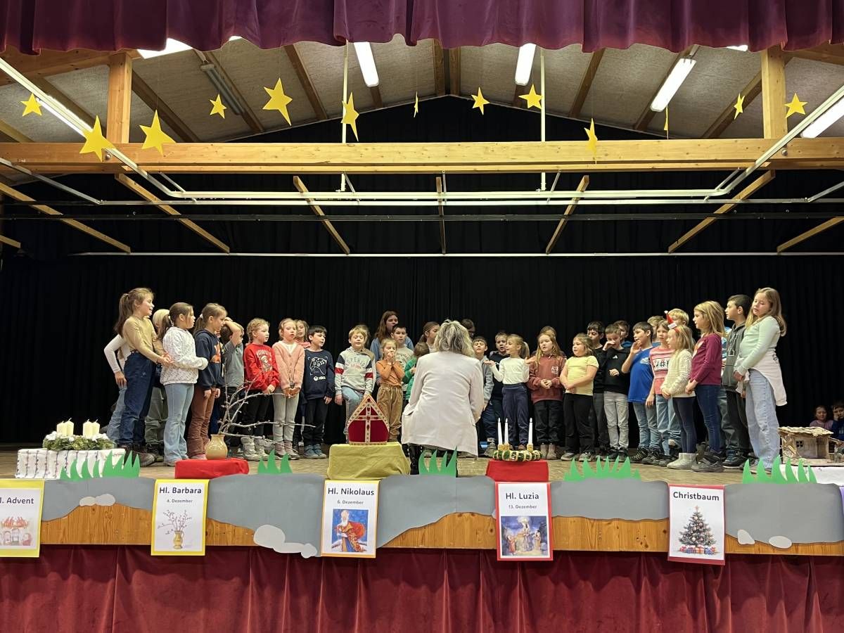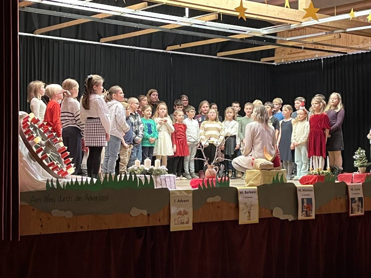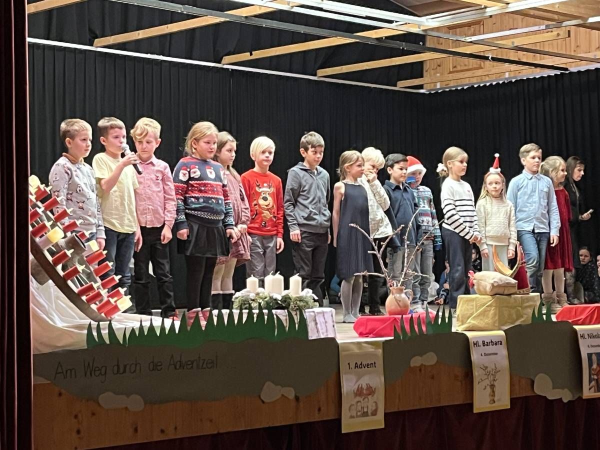 Am Do, dem 18. 12., unternahmen wir gemeinsam mit Eltern, Großeltern und vielen anderen Gästen in der Kulturhalle Reisenberg eine Reise durch die Adventzeit. Unsere Geschichte begann mit dem 1. Adventkranz, den Hr. Johann Hinrich Wichern vor fast 200 Jahren aus einem Wagenrad mit 20 roten Wochentags- und 4 weißen Sonntagskerzen in einem Kinderheim in Deutschland bastelte. Weitere Stationen waren die hl. Barbara, der hl. Nikolaus, die hl. Luzia, der Christbaum und schließlich als Schlusslicht die Krippe im Stall. Viele Lieder, Gedichte und auch ein Tanz wurden den Eltern in einer besinnlichen, feierlichen Atmosphäre geboten. Nach großem Applaus konnten sich alle am Buffet des EVs laben - an dieser Stelle ein ganz großes Dankeschön an alle, die bei den Vorbereitungen, der Durchführung und der Nachbereitung der Feier mitgewirkt haben, denn ohne die Hilfe aller kann so ein Fest nicht zustande kommen! Auch der Musikschule, die uns ebenfalls ohne zu zögern mit ihren Tönen unterstützt, gilt unser großer Dank!