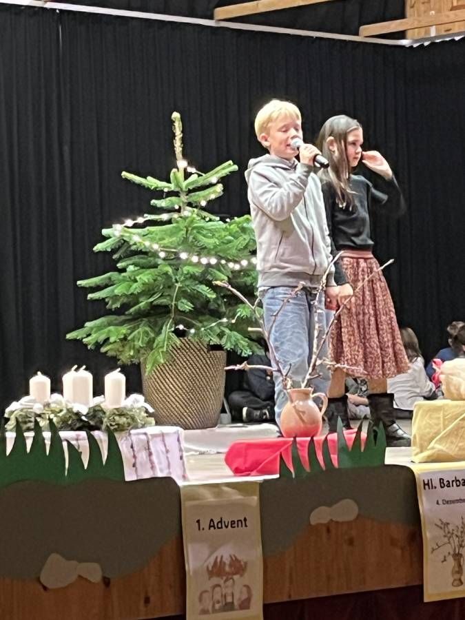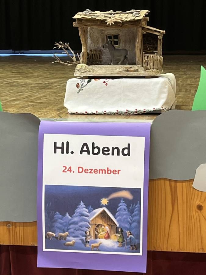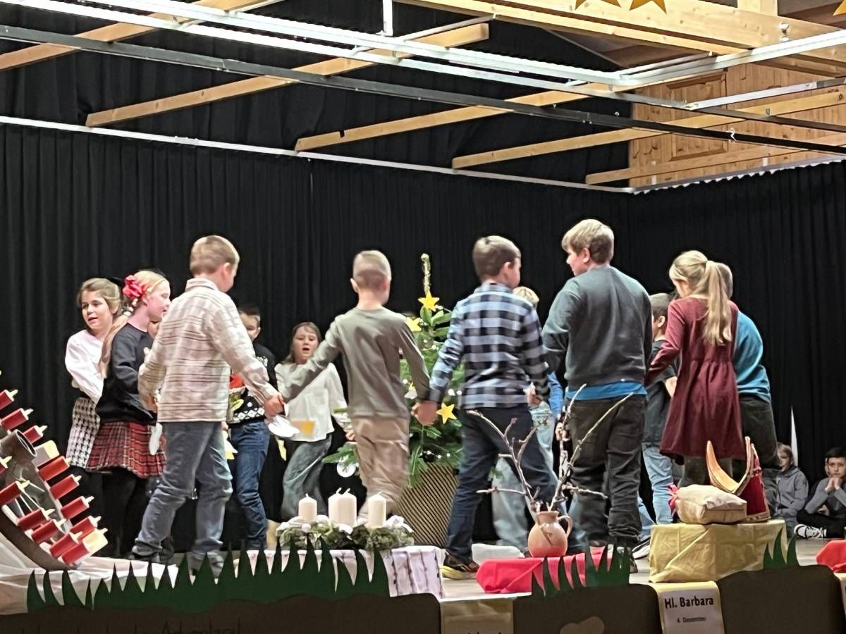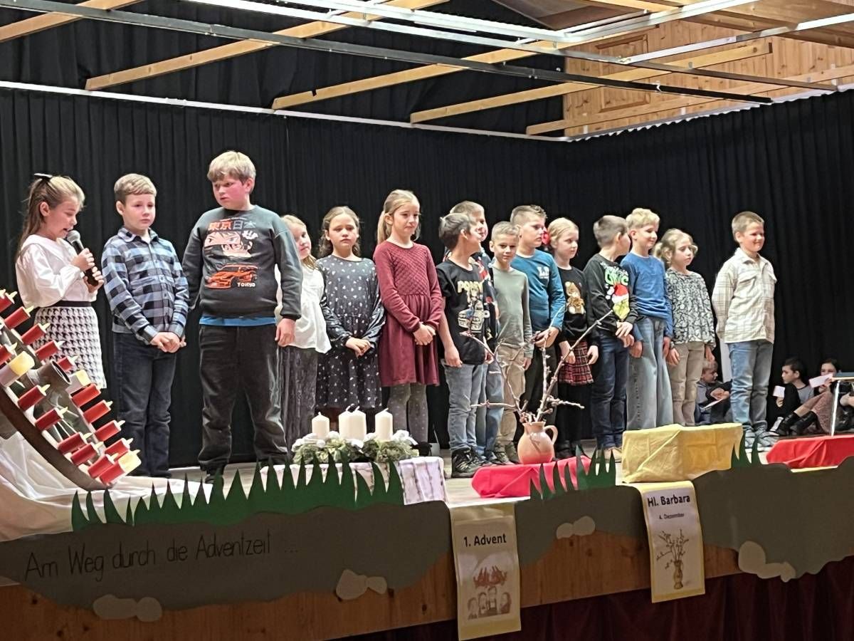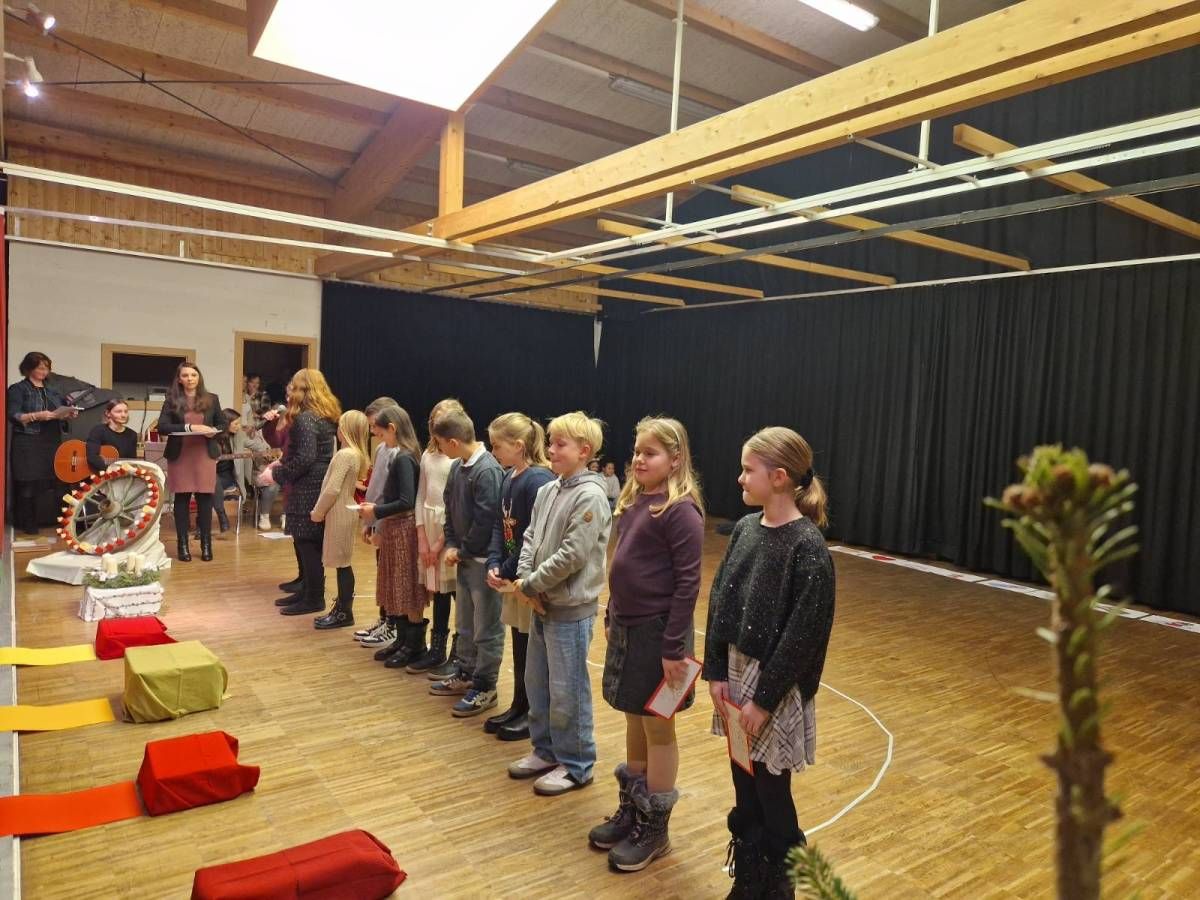 Am Do, dem 18. 12., unternahmen wir gemeinsam mit Eltern, Großeltern und vielen anderen Gästen in der Kulturhalle Reisenberg eine Reise durch die Adventzeit. Unsere Geschichte begann mit dem 1. Adventkranz, den Hr. Johann Hinrich Wichern vor fast 200 Jahren aus einem Wagenrad mit 20 roten Wochentags- und 4 weißen Sonntagskerzen in einem Kinderheim in Deutschland bastelte. Weitere Stationen waren die hl. Barbara, der hl. Nikolaus, die hl. Luzia, der Christbaum und schließlich als Schlusslicht die Krippe im Stall. Viele Lieder, Gedichte und auch ein Tanz wurden den Eltern in einer besinnlichen, feierlichen Atmosphäre geboten. Nach großem Applaus konnten sich alle am Buffet des EVs laben - an dieser Stelle ein ganz großes Dankeschön an alle, die bei den Vorbereitungen, der Durchführung und der Nachbereitung der Feier mitgewirkt haben, denn ohne die Hilfe aller kann so ein Fest nicht zustande kommen! Auch der Musikschule, die uns ebenfalls ohne zu zögern mit ihren Tönen unterstützt, gilt unser großer Dank!