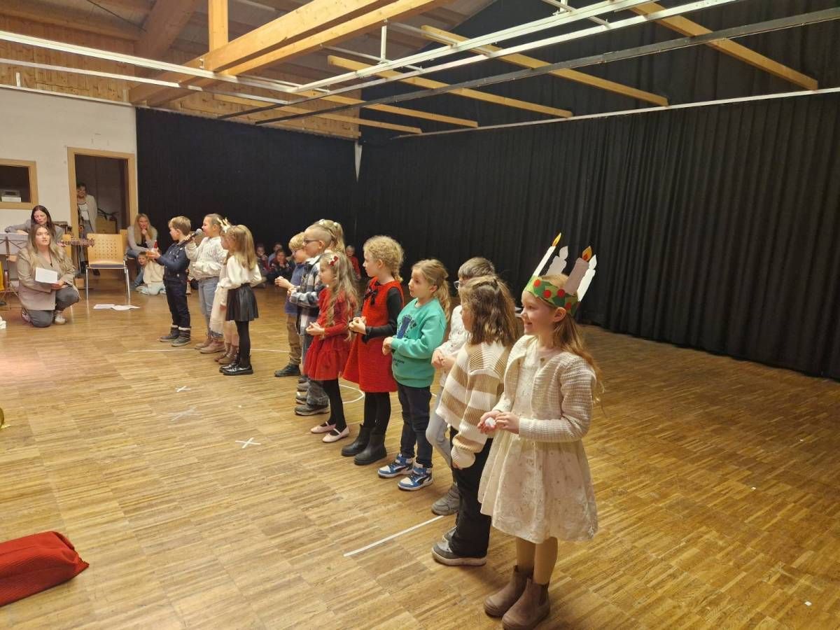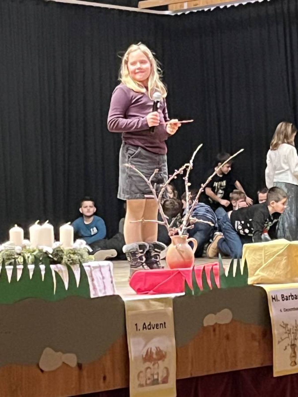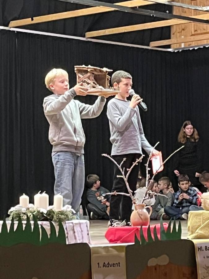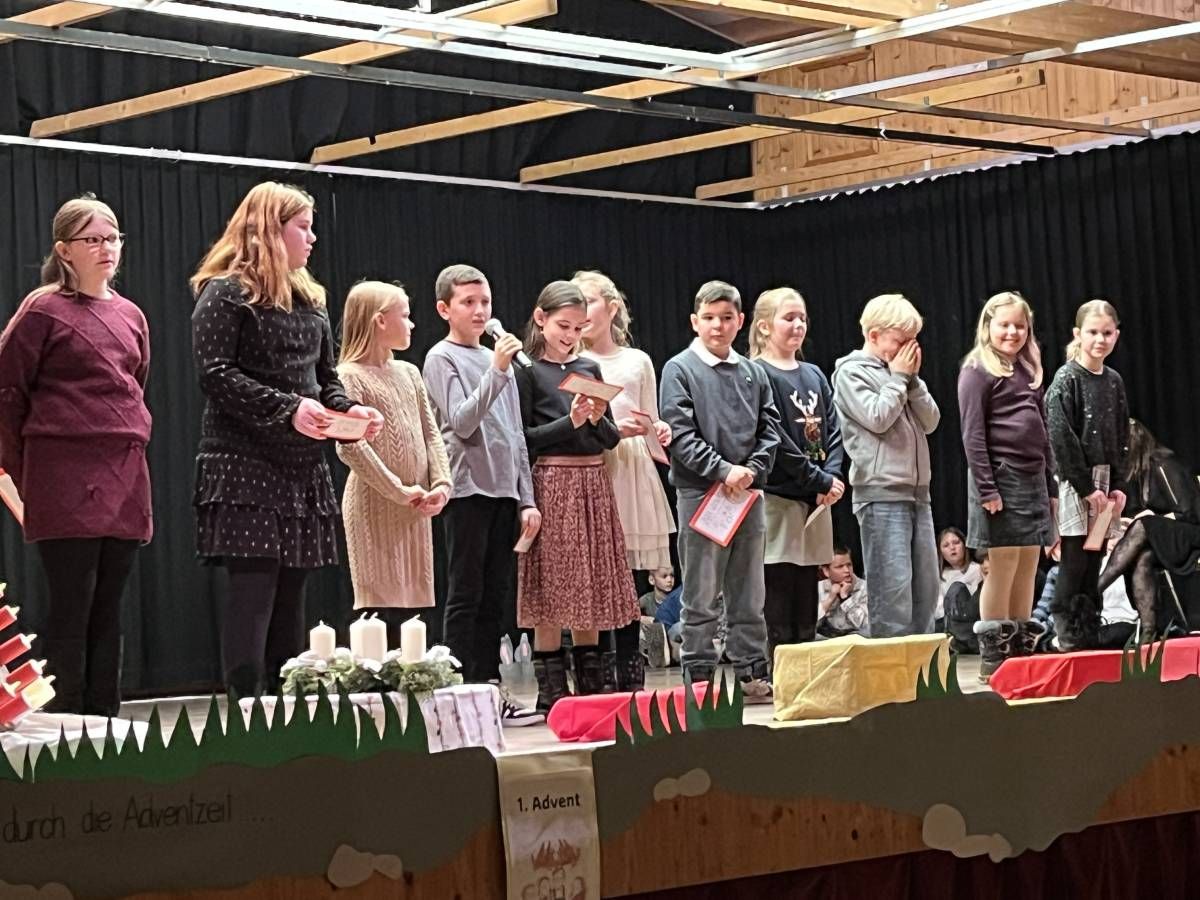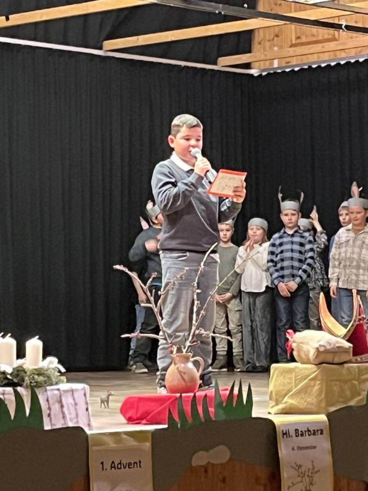 Am Do, dem 18. 12., unternahmen wir gemeinsam mit Eltern, Großeltern und vielen anderen Gästen in der Kulturhalle Reisenberg eine Reise durch die Adventzeit. Unsere Geschichte begann mit dem 1. Adventkranz, den Hr. Johann Hinrich Wichern vor fast 200 Jahren aus einem Wagenrad mit 20 roten Wochentags- und 4 weißen Sonntagskerzen in einem Kinderheim in Deutschland bastelte. Weitere Stationen waren die hl. Barbara, der hl. Nikolaus, die hl. Luzia, der Christbaum und schließlich als Schlusslicht die Krippe im Stall. Viele Lieder, Gedichte und auch ein Tanz wurden den Eltern in einer besinnlichen, feierlichen Atmosphäre geboten. Nach großem Applaus konnten sich alle am Buffet des EVs laben - an dieser Stelle ein ganz großes Dankeschön an alle, die bei den Vorbereitungen, der Durchführung und der Nachbereitung der Feier mitgewirkt haben, denn ohne die Hilfe aller kann so ein Fest nicht zustande kommen! Auch der Musikschule, die uns ebenfalls ohne zu zögern mit ihren Tönen unterstützt, gilt unser großer Dank!